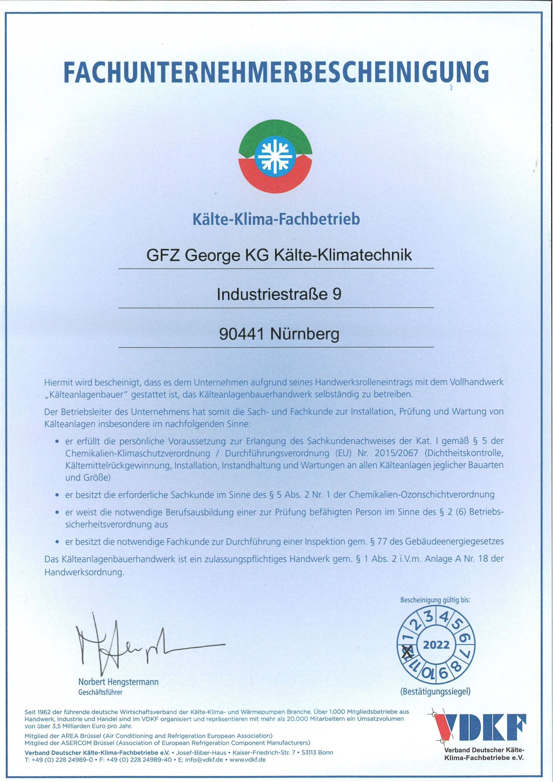 GFZ George KG als autorisierter Kälte-Klima-Fachbetrieb erfüllt diese Voraussetzungen und steht Ihnen als kompetenter Ansprechpartner gerne zur Verfügung.